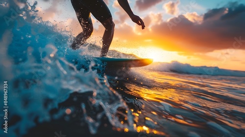 surfer, surfboard, wave, sunrise, ocean, water, sea, sky, sun, splashing, motion, energy, thrill, adventure, recreation, sport, outdoors, nature, landscape, coastal, tropical, blue, orange, dynamic, action, movement, adrenalin, freedom, harmony, solitude, challenge, passion, pursuit, balance, grace, rythm, connection, calmness, rejuvenation, transformation, awakening, hugs, optimism