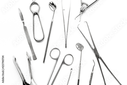 Surgical scissors and forceps. Medical metal hand tools and equipment on white, top view