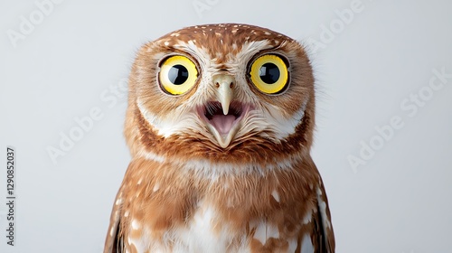 Surprised Brown Owl Close Up Portrait Against Light Gray Background