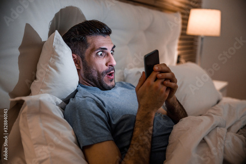 bed, male, bedchamber, home, man, lifestyle, caucasian, rest, room, photogenic, apartment, adult, hotel, stubble field, happy, indoor, bachelor, guy, cheerful, beard, cyberspace, contraption, modern, technology, sharpened, young, phone, mobile phone, mobile, call, communicate, smart, use, wireless, sleep, lie, dream, surf, social, network, screen, digital, relax, night, pajama, chat, message, smile, surprise