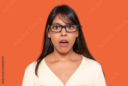 Surprised woman with glasses showing a shocked expression against a bright orange background