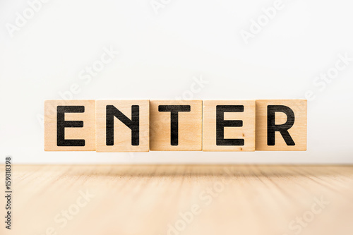 enter, input, decision, decoration, in, icon, key, element, three-dimensional, glossy, graphic, information, modern, start, symbol, word, letter, wood, desk, table, floor, signs, text, wooden, cube, float, fly, concept, zero gravity, creative, idea, business, minimalism, simple, closeup