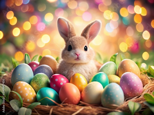 Surreal Easter Scene with Cute Toy Bunny Rabbit Surrounded by Colorful Eggs in a Whimsical Setting for Festive Postcards and Posters Celebrating Easter Day
