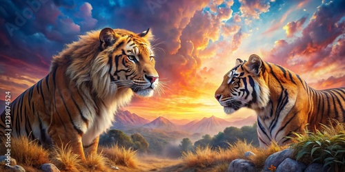 tiger, lion, big cat, wildlife, confrontation, surreal, fantasy, dreamlike, landscape, power, majestic, animal, nature, fierce, intense, gaze, art, photo, image, picture, wallpaper, background, digital artwork, painting, illustration, predator, prey, jungle, forest, savanna, clash, battle, fight, rivalry, competition, strength, wild animal, cat, felino, animal kingdom, wild