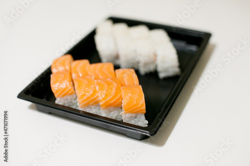 Sushi on a black plate takeout isolated. Japanese food delivery and takeaway.