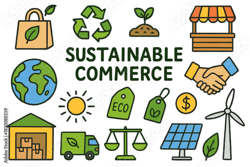 Sustainable Commerce Doodle. sustainable commerce. Colorful Hand-drawn doodle Children illustration sustainable commerce globe, shopping bag, recycled box,