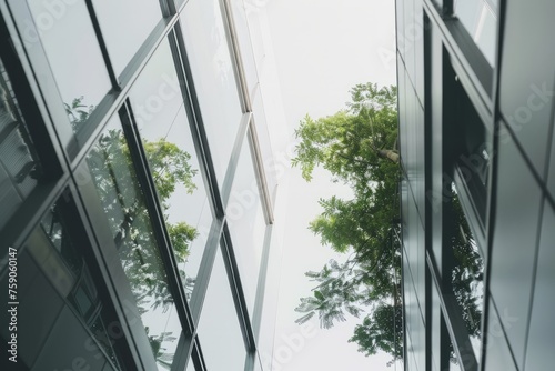 Sustainable green buildings in modern cities, sustainable glass office buildings, trees reduce heat and carbon dioxide. Green office building. Environmental green. Modern green office buildings reduce