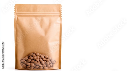 Sustainable stand-up pouch filled with assorted snacks on a clean white background for creative packaging ideas