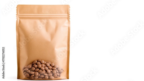Sustainable stand-up pouch filled with assorted snacks on a clean white background for creative packaging ideas