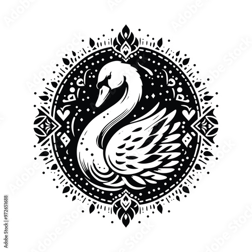 Swan bird in bohemian black and white silhouette illustration