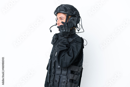SWAT caucasian woman isolated on white background keeping a conversation with the mobile phone with someone