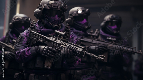 SWAT Company soldiers in formation, ready for battle. They are equipped with modern firearms and are in a ready position, giving the impression of an imminent threat, purple and black