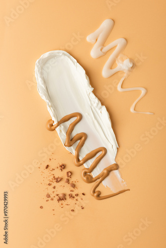 Swatches or smears of creamy texture on a beige background. Skin care cream, face serum, body lotion