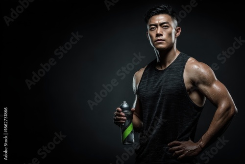 fitness, exercise, physical exercise, athlete, perspiring, hydratation, health, wellness, muscle, strength, training, sport, bodybuilding, gym, tank top, water bottle, healthy lifestyle, physical fitness, motivation, determination, masculine, male, strong, toned, active, activewear, studio shot, dark background, performance, energy, lifestyle, confident, photogenic, powerful, portrait, fit, body, well-being, healthy, sweaty, determined, exercising, physical activity, weightlift, water