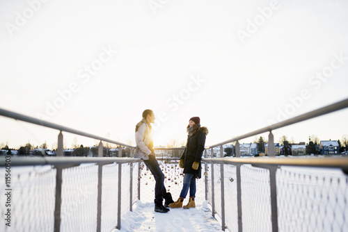horizontal, outdoors, face to face, foulard, missy, young couple, winter, sunlight, dusk, full-length, selective focus, backlit, young men, railing, warm clothes, footbridge, two people, sweden, jacket, snow, clear sky, copy space, standing, leaning, togetherness, female, lady, woman, guy, man, male, people, sunset, twilight, evening, sundown, youngster, male, clothing, pair, swedish, europa, northern europe, scandinavia, european, scandinavian, jacket, headgear, weather, together, outside, foulard, 20s, 20s, missy, female, young adult, 20 years, young men, heterosexual, wintery, sunny, sunshine