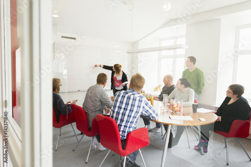 Sweden, Young woman drawing on white board during work meeting