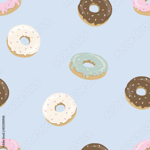 Sweet colorful Donut seamless pattern, pastel colors, vector birthday party pattern, blue background