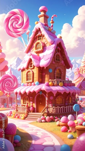 sweet, gingerbread, house, candy, town, pink, lollipop, cloud, mountain, cute, colourful, pastel, dreamlike, fantasy, magical, high-coloured, cartoon, digital, art, illustration, whimsical, delightful, adorable, landscape, exterior, building, home, decorated, sweet, detail, charming, deliciously, delicious, treat, nature, design, structure, cosy, playful, imagination, children, children