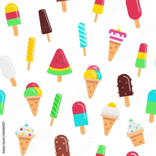 Sweet ice cream flat colorful seamless pattern, vector stock illustration isolated on white background. Different kinds of ice cream.