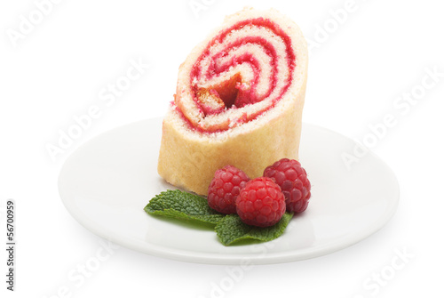 Sweet roll cake with raspberry jam and berries, isolated on a wh