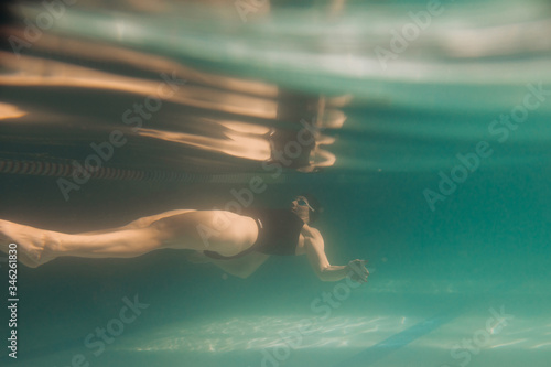 Swimming instructor swimming under water