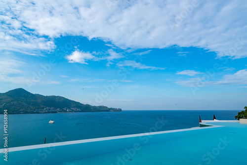 Swimming pool with stair on top of roof deck building looking at view tropical sea ,Luxury beach villa house with sea view swimming pool in modern design,Summer Vacation and travel background concept