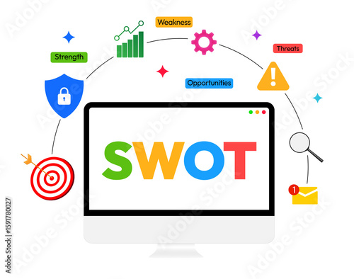 Swot analysis concept in multiple colors showing on the computer screen for business growth, strategy, marketing, strength, weakness, opportunity, threats