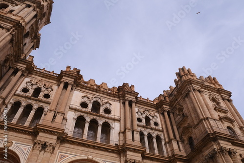 Symmetrical fragment of architecture of the Cathedral Tower. The Cathedral of Malaga is a national landmark. Old Town of Malaga, Andalusia, southern Spain, Europa.