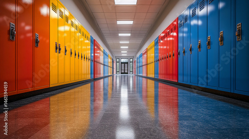school, locker, hallway, colourful, education, bright, symmetry, back to school, door, interior, fluorescent, academic, high-coloured, perspective, yellow, red, blue, modern, clean, building, institutional, entrance, architecture, classroom, storage, learning, structured, high school, middle, teaching, safety, order, institution, organised, metal, colours, empty, neat, design, structure, public