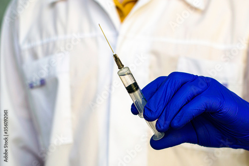 syringe with medicine in the doctor s hand in a white coat the figure of a doctor in blur in a background