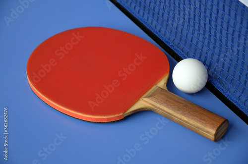 Table Tennis Paddle and ball near net on the blue table