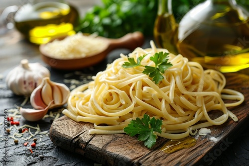 garlic, pasta, oil, spaghetti, pepper, spicey, chili, red, parsley, table, green, food, white, eatery, italy, spice, olive oil, dinner, lunch, dish, seasoning, salt, fork, ingredient, clove, deck, horizontal, cruet, closeup, cooked, italian, receipe, simple, tasty, vegetarian