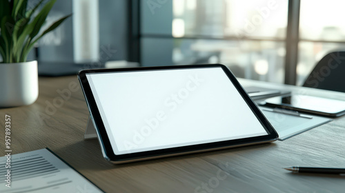 Tablet On Conference Room Table With White Screen Mockup For Client Custom Content Integration . Generative ai