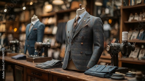 Tailoring workshop suits on mannequins measuring tapes and sewing machines in action