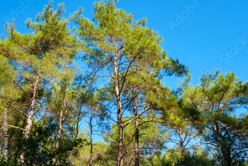 Tall and slender pine tree trunks rising towards the azure sky with tufts of green needles creating a textured canopy in the peaceful woods