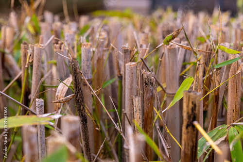 Tall bamboo stalks rise from fertile ground, showcasing nature's beauty during a serene afternoon scene in a lush garden