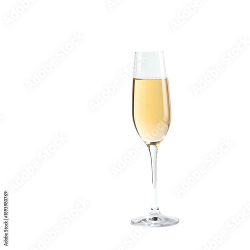 Tall, elegant champagne flute with effervescent, golden liquid, isolated on black