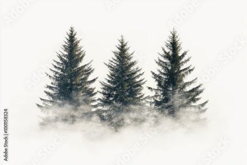 Tall evergreen trees stand amidst a thick fog, creating a tranquil atmosphere in a serene forest setting