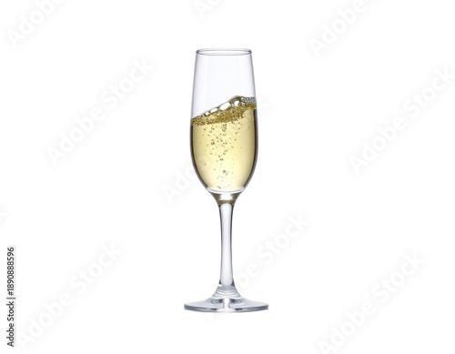 Tall flute glass of bubbly golden liquid with effervescent bubbles, isolated