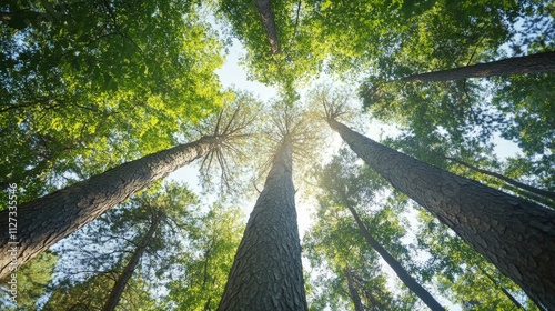 Tall forest trees reaching towards the sky with sunlight filtering through lush green foliage creating a serene and peaceful atmosphere.