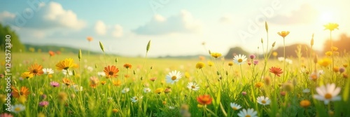 Tall grasses and wildflowers swaying in gentle breeze, meadow, wind-blown