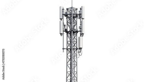 Tall, metallic tower, adorned with communication equipment, stands alone