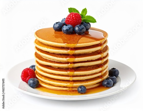 Tall stack of fluffy golden pancakes on a white plate is drenched in sweet syrup, topped with fresh blueberries, juicy raspberries, and a green mint leaf.