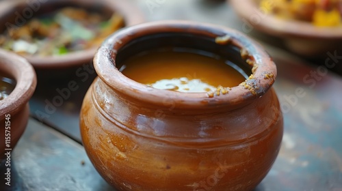 Tandoori tea in a traditional clay pot showcasing rich color and texture with rustic background elements