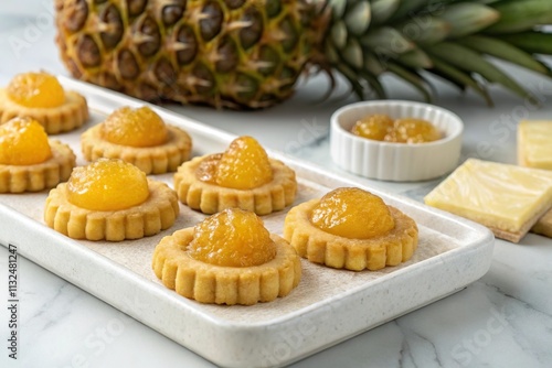 tart, cake, jam, pineapple, serving, tray, sweet, dessert, snack, topping, cookie, yellow, tropical, taste, favor, pastry, homemade, delicious