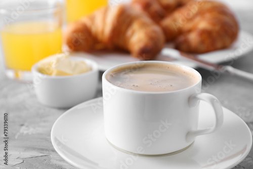 Tasty breakfast. Cup of coffee, butter and fresh croissants on grey table, closeup