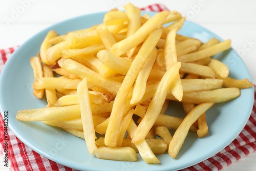 Tasty french fries on white table, closeup