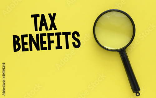 TAX BENEFITS words on yellow paper next to a black magnifier. Finance and business concept.