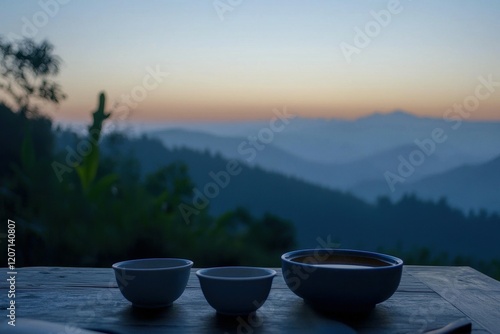 Tea Ceremony at Sunrise: A quiet morning scene with a tea table on a hilltop, the first light of dawn illuminating the tea leaves and cups