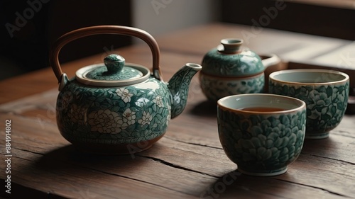Tea ceremony traditional teapot and ceramic cups on wooden table.